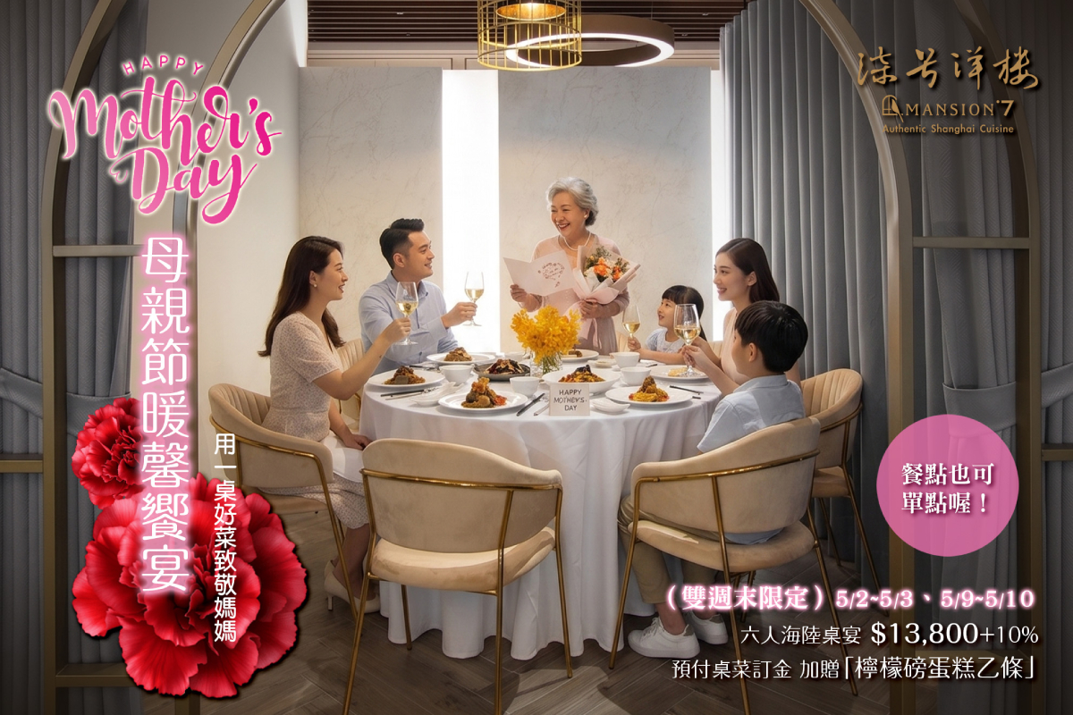 本次母親節饗宴於 5/2–5/3、5/9–5/10 兩個週末限定推出。其中主打「上海經典海陸六人桌宴」每桌 $13,800 +10%。凡預付桌菜訂金,即可加贈「檸檬磅蛋糕一條」,為母親節增添一份甜蜜祝福。